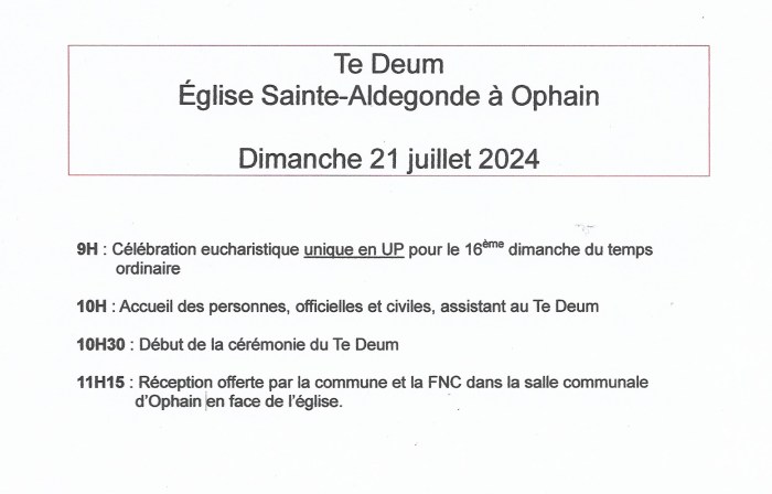 TE DEUM – 21 juillet 2024 – Ophain Te Deum 21 juillet 2024 – horaireTélécharger Partager : Cliquer pour partager sur X(ouvre dans une nouvelle fenêtre) X Cliquez pour partager sur Facebook(ouvre dans une nouvelle fenêtre) Facebook J’aime chargement…